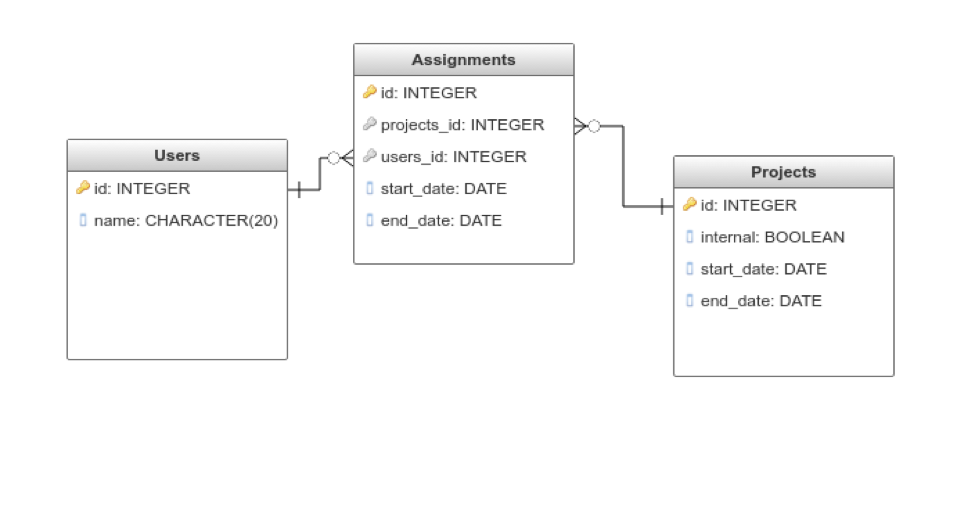 The database structure in terms of user-to-project relation looks as follows: